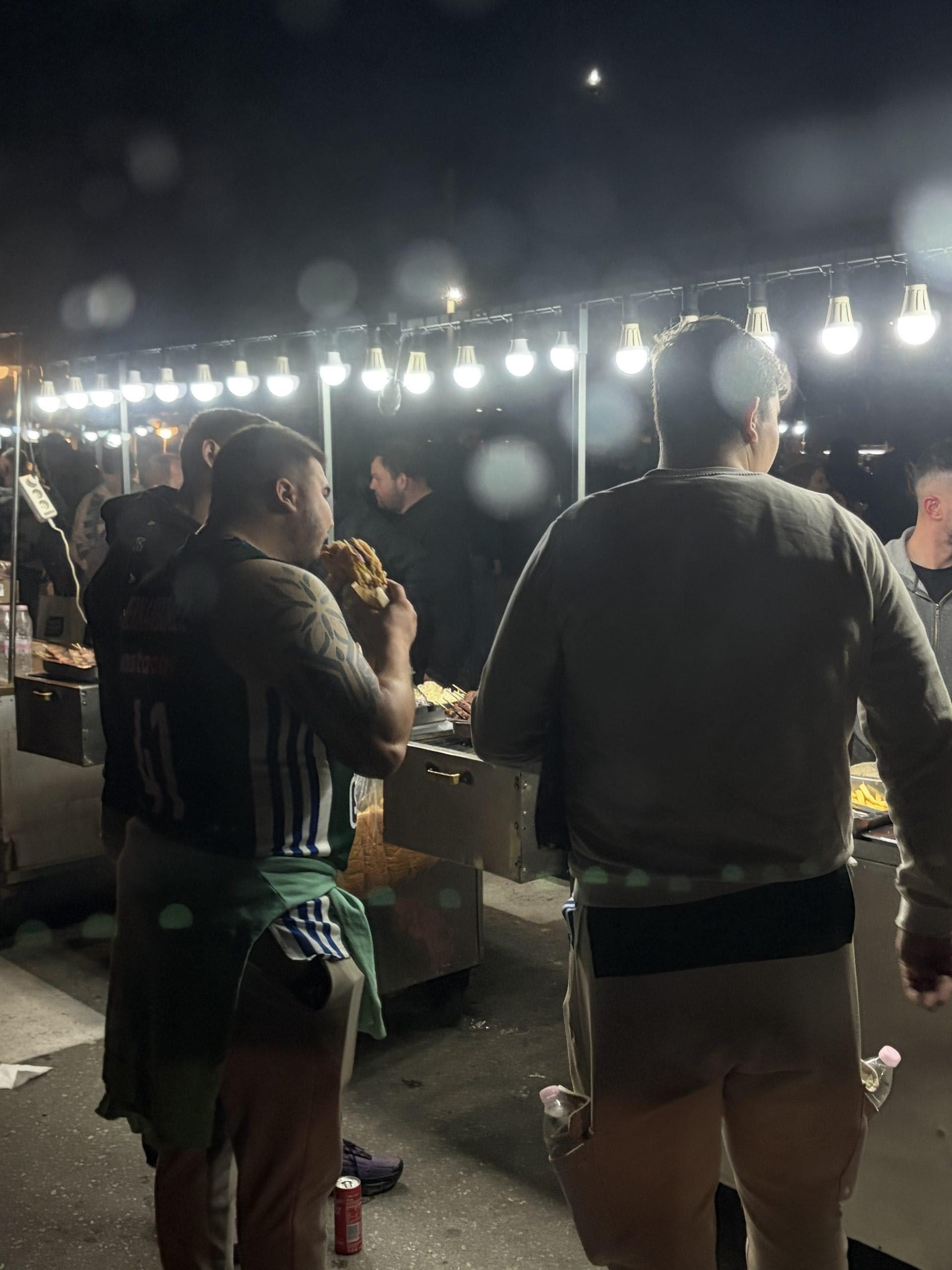 Izlazak sa parkinga bio je jedina bolna tačka ove večeri. Trebalo nam je oko 40 minuta da se uopšte pomerimo, što mi je dalo vremena da kroz prozor posmatram navijače kako se razilaze. Oko arene su se odmah pojavili štandovi sa uličnom hranom, a miris sveže pripremljenih sendviča i hot-dogova, po cenama od pet do osam evra, ispunio je noćni vazduh Atine.