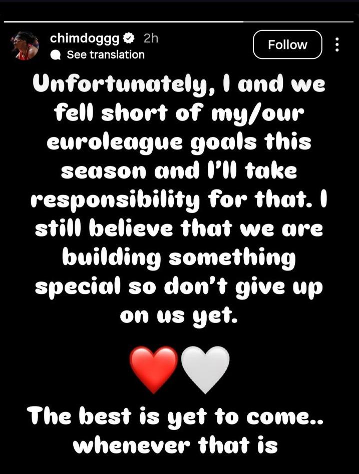 – Nažalost, ja i moj tim nismo ostvarili naše ciljeve u Evroligi ove sezone i preuzimam odgovornost za to. I dalje verujem da gradimo nešto posebno, zato nemojte još da odustajete od nas. Najbolje tek dolazi… Kad god to bilo – napisao je Čima Moneke na Instagramu „storiju“.