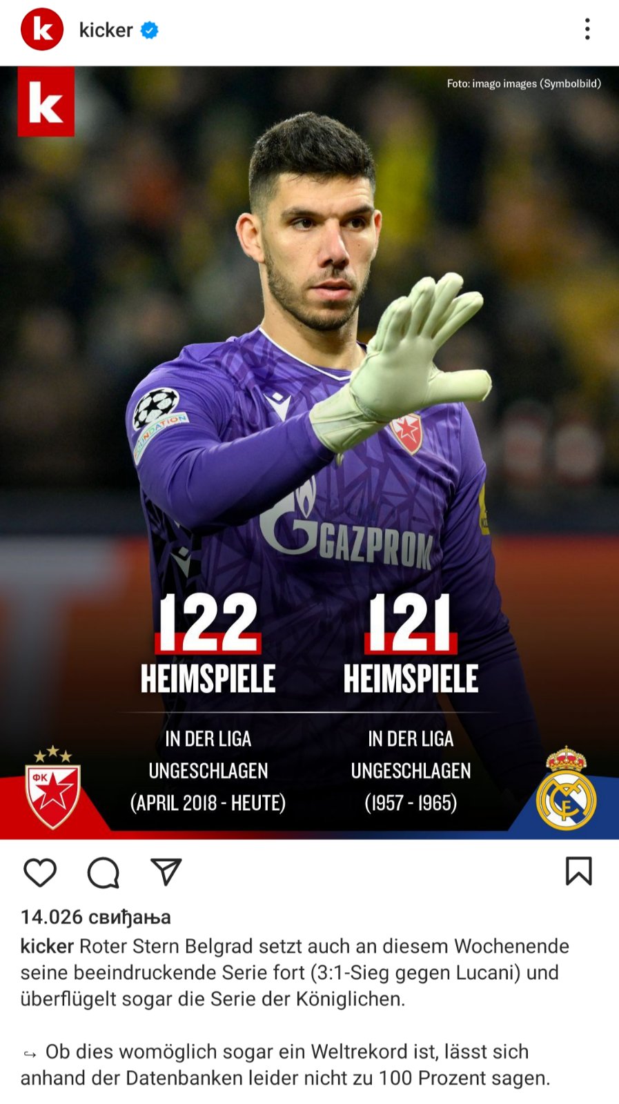 O obaranju svetskog rekorda svoju javnost je obavestio prestižni i ugledni nemački „Kiker“. Oni su tu vest objavili i na svom instagram profilu koji prati . Na slici je golman Omri Glazer sa grbovima i brojevima Crvene zvezde i Real Madrida. U opisu stoji tekst: