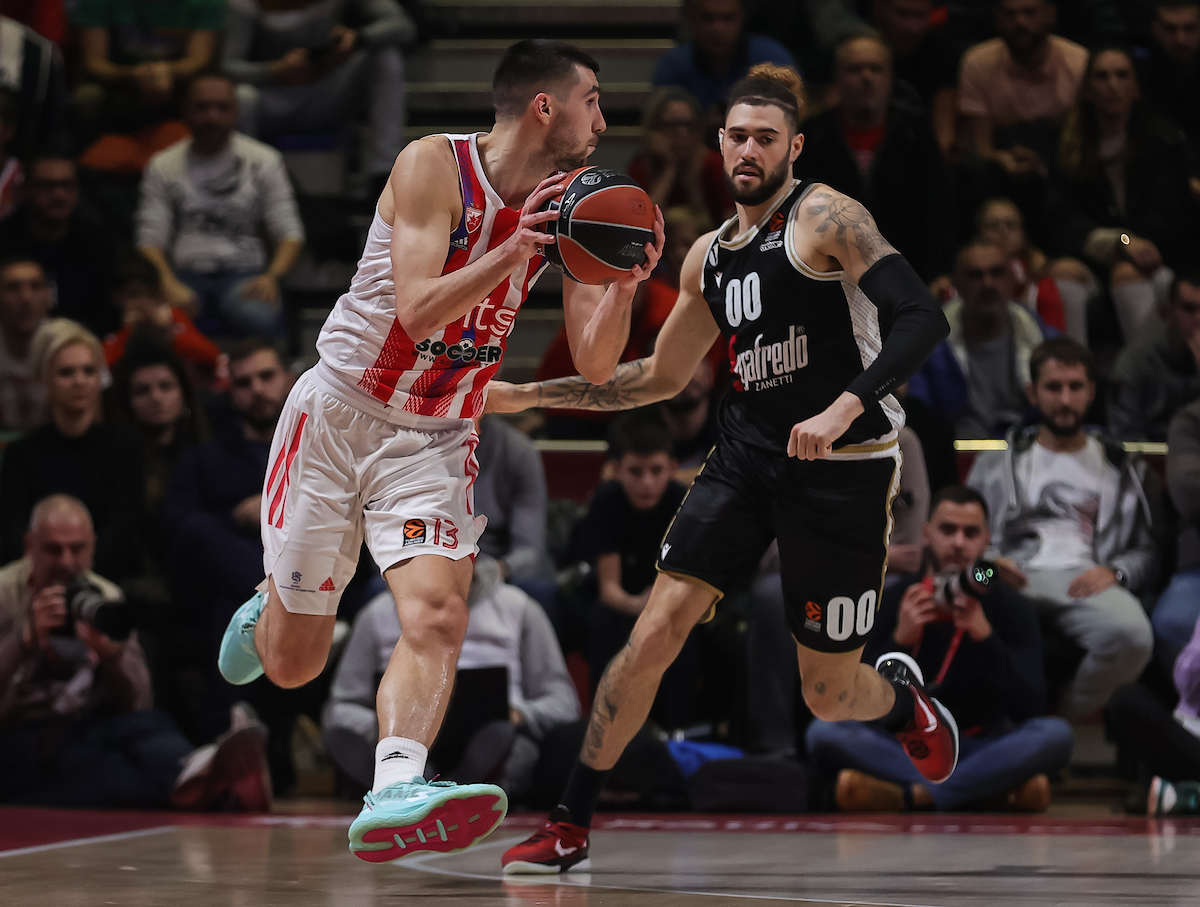 Završeno je prvo poluvreme na utakmici između Crvene zvezde i Virtusa u dvorani „Aleksandar Nikolić“. Iako je domaćin u dva navrata imao dvocifreni zaostatak, uspeo je da preokrene i da na veliki odmor ode sa vođstvom – 42:41.