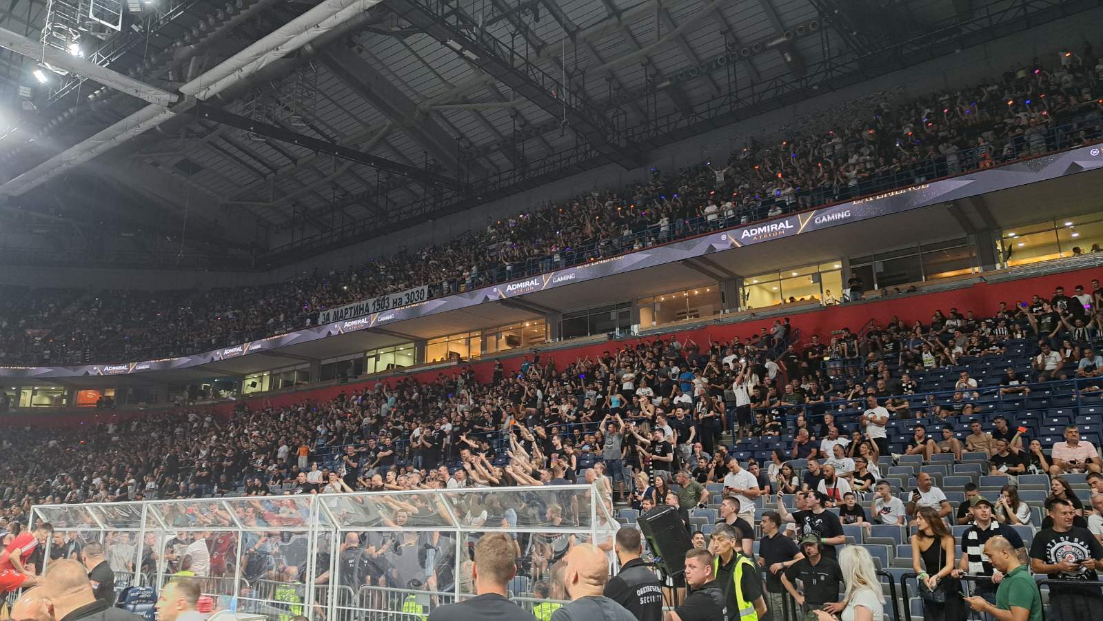 Meč se igra u beogradskoj „Štark areni“, koju su okupirale mnoge poznate ličnosti, uglavnom navijači crno-belih: Novica Veličković, Nikola Milutinov, Dragan Bjelogrlić, Igor Duljaj, Saša Zdjelar, Matija Nastasić, Miško Marić…
