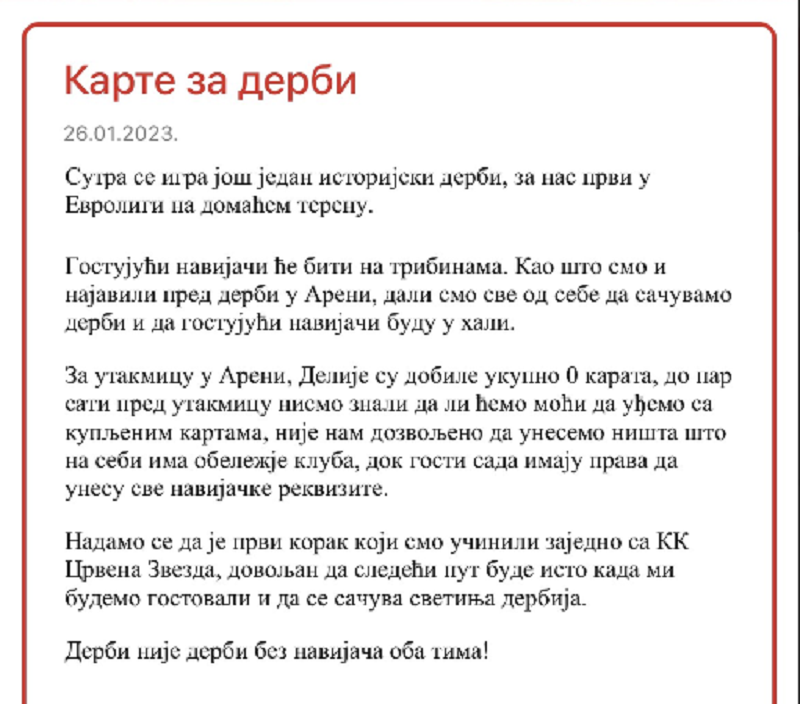 – Sutra se igra još jedan istorijski derbi, za nas prvi u Evroligi na domaćem terenu. Gostujući navijači će biti na tribinama. Kao što smo i najavili pred derbi u Areni dali smo sve od sebe da sačuvamo derbi i da gostujući navijači budu u hali. Za utakmicu u Areni, Delije su dobile ukupno „0 „karata, do par sati pred utakmicu nismo znali da li ćemo moći da uđemo sa kupljenim kartama, nije nam dozvoljeno da unesemo ništa što na sebi ima obeležje kluba, dok gosti sada imaju prava da unesu sve navijačke rekvizite. Nadamo se da je prvi korak koji smo učinili zajedno sa KK Crvena Zvezda, dovoljan da sledeći put bude isto kada mi budemo gostovali i da se sačuva svetinja derbija – napisale su „Delije“ i dodale: