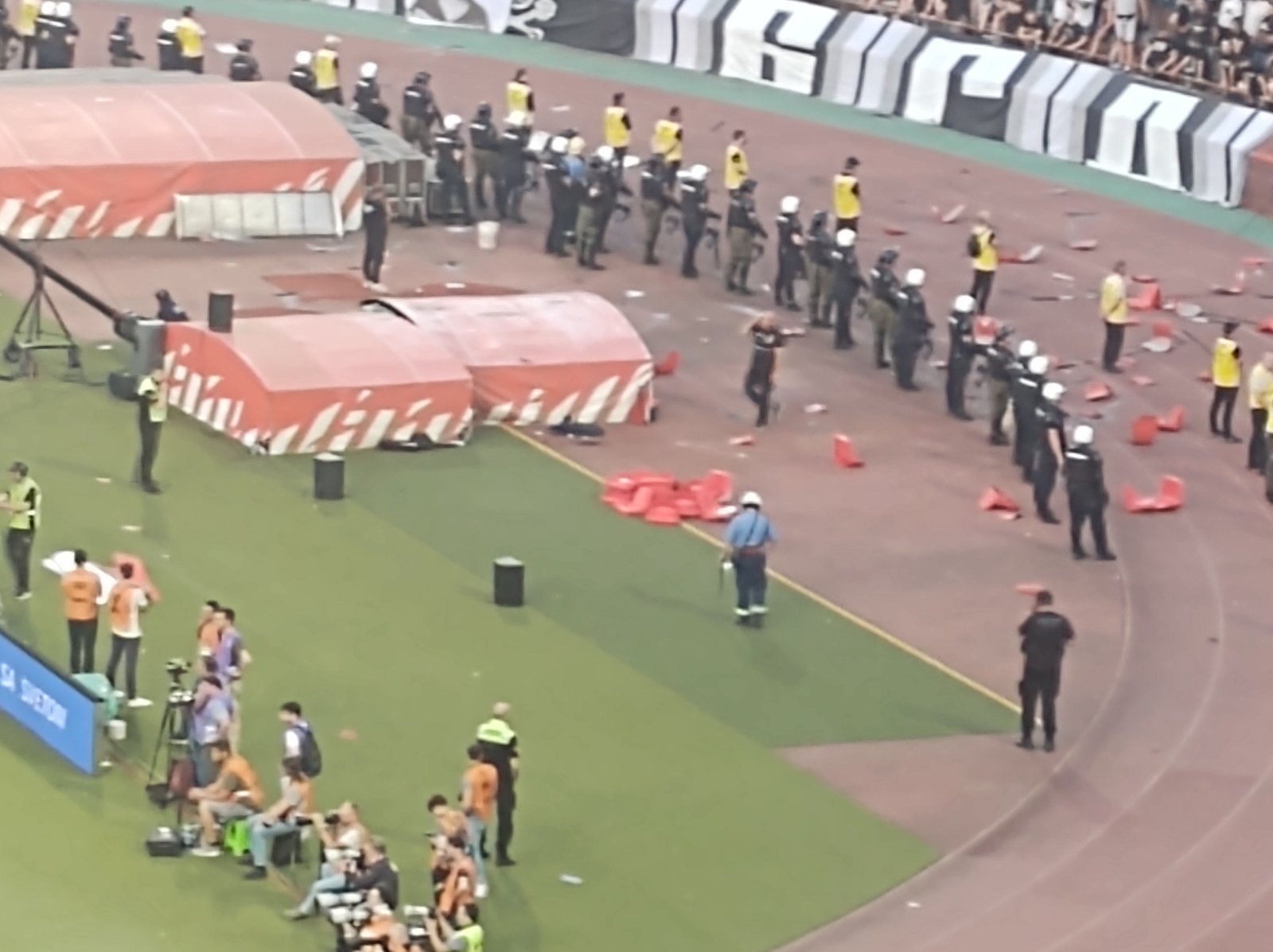 Do „ludila“ je doveo i „grobare“ koji su tek završili slavlje gola Slobodana Uroševića. Gol Aleksandra Kataija iznervirao je navijače Partizana koji su počeli da lome stolice na južnoj tribini.