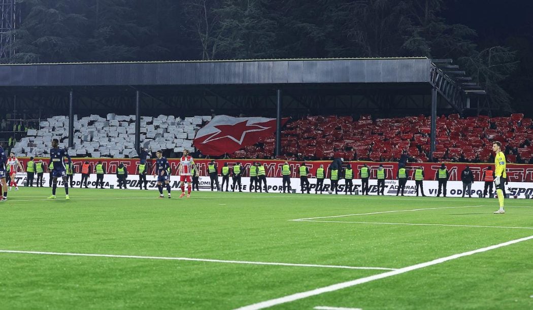 Vaterni navijači Crvene zvezde su tokom prvog poluvremena napravile lepu koreografiju. Crveno-beli kartoni i u sredini grb kluba. Kasnije se pojavila zastava grupe „Brigadiri“. Evo kako je to izgledalo: